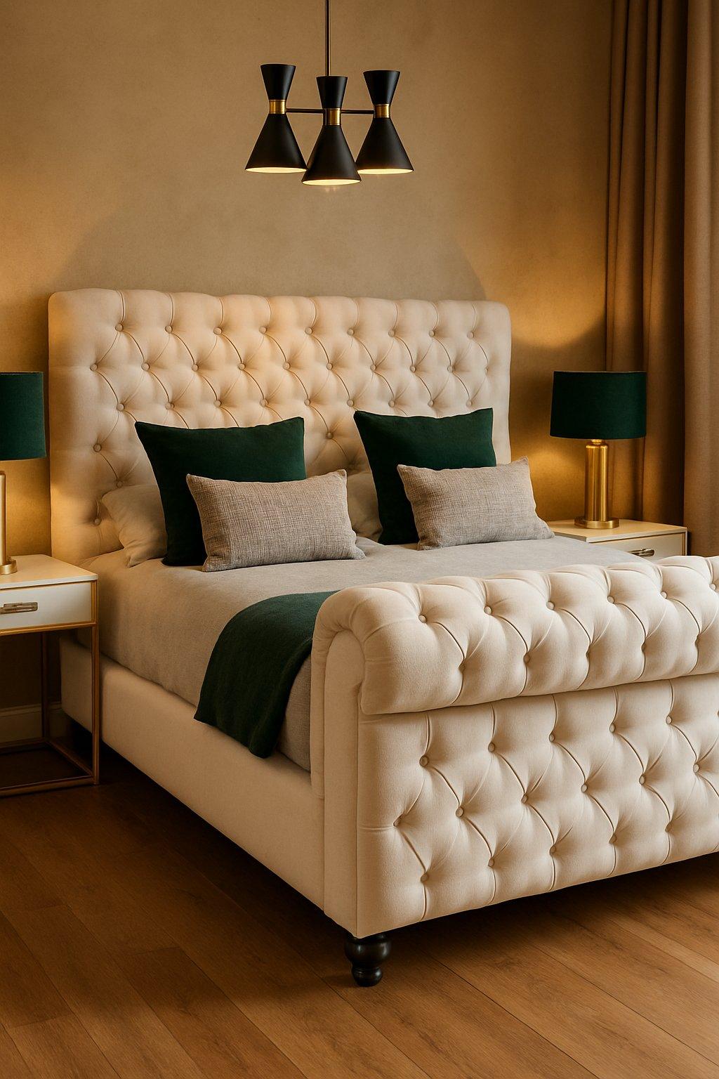 Elevate your bedroom with the timeless elegance of the Deluxe Essex Sleigh Bed, a statement piece designed for luxury interiors. Featuring a beautifully sculpted sleigh silhouette and deep diamond tufting, this bed brings sophistication and refinement to any master suite. The plush cream upholstery adds warmth and texture, while the rolled headboard and footboard create a classic Chesterfield-inspired profile that never goes out of style.