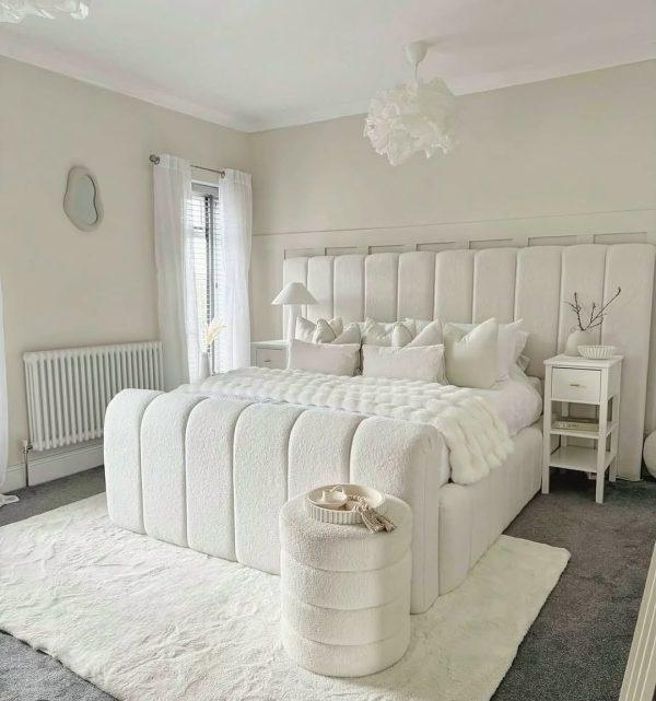 Wrap your bedroom in elegance and comfort with the Luxury Ivory Bouclé Bed, a stunning centerpiece that combines modern design with timeless sophistication.